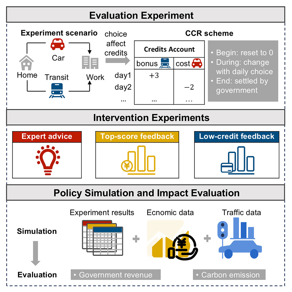 The study tests a carbon Credit-Charge-cum-Reward (CCR) policy using 270 participants. Actual traveler behavior deviates from rational theoretical predictions showing reduced fiscal responsibility, especially among high–value-of-time users. Three low-cost behavioral “nudges” are evaluated. Only the downward-comparison feedback (showing low-credit benchmarks) significantly increases driving, improves stability, and generates the highest fiscal revenue with modest emission increases. A Beijing case study shows potential savings of up to 2.4 billion CNY over six years. The study concludes that targeted non-financial interventions can substantially enhance CCR policy performance.